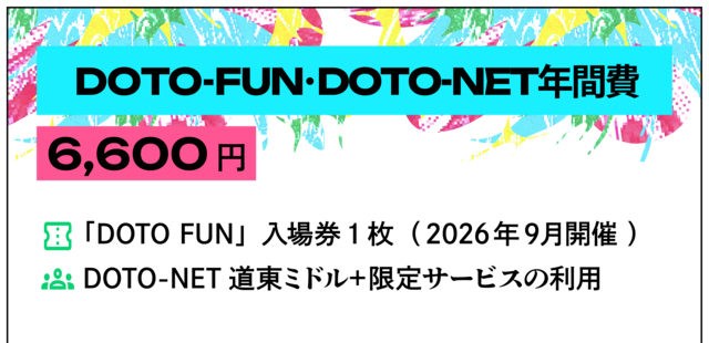 DOTO FUN参加チケット+道東ミドル+会員サービス付きパック **道東をもっと楽しみたいあなたへ!** イベント参加・会員サービスが揃った、お得なパックです。 --- ### 【セット内容】 * **「DOTO FUN 2026」入場チケット(1枚)** 道東を楽しみ、つながるリアルイベント「DOTO FUN」に参加いただけます。 ※開催日:2026年9月予定/開催地:道東某所(詳細は後日メールにてご案内) ※29歳以下の方はDOTO-NETにて「道東ヤング」に登録することで、無料でご参加いただけます。登録はこちら → https://dotonet.dotdoto.com/ ※DOTO FUNについて、詳しくは以下のクラウドファンディングページをご覧ください https://camp-fire.jp/projects/849725/view * **「DOTO-NET・道東ミドル+」年会員サービス(有効期限:2026年9月末まで)** 地域の仲間とつながり、さまざまな限定サービスを受けられる会員制度(通常年会費6,600円税込)を期間限定でご提供します。 会員サービスの詳細は → [https://dotonet.dotdoto.com/](https://dotonet.dotdoto.com/) ※本商品ご購入後、ドット道東より入会案内メールをお送りします。そちらにご対応いただくことでサービス開始となります。 --- ### 【ご注意事項】 ※本商品は無形商品(電子チケットおよびオンラインサービス)のため、発送物はありません。 ※購入後、5営業日以内にご登録メールアドレス宛へご案内メールを送付いたします。 ※ご案内メール内のGoogleフォームに必要情報をご入力いただき、送信をもってサービス提供開始となります。 ※メールおよびGoogleフォーム入力をもって納品完了となります。 ※ご案内メール送付後、30日以内にフォーム登録・ご案内メールへの返信がない場合、サービス提供を開始できません。期限を過ぎた場合の返金対応は行っておりません。 ※天候・災害・行政要請その他やむを得ない事情により、イベント内容が変更・中止となる場合があります。その場合も返金には応じかねます。 ※ご入力いただいた個人情報は、イベント運営およびコミュニティ参加に必要な目的の範囲内で利用します。 ※取得した情報は当方および公式連携パートナー以外には提供いたしません。 ※商品の性質上、購入後のキャンセル・返金は承っておりません。 ※やむを得ず「DOTO FUN」にご来場いただけない場合も返金はできかねます。 ※イベントへの交通費・滞在費はお客様のご負担となります。 ※「DOTO FUN」入場案内は準備が整い次第、メールにてご連絡いたします。 ※「DOTO FUN」は道東ヤング・道東ミドル+会員限定イベントです(15歳以下は保護者同伴で無料入場可) ※迷惑メールフォルダに入る場合がございますのでご確認ください。 ※メールが届かない場合は注文情報とともにお問い合わせください。